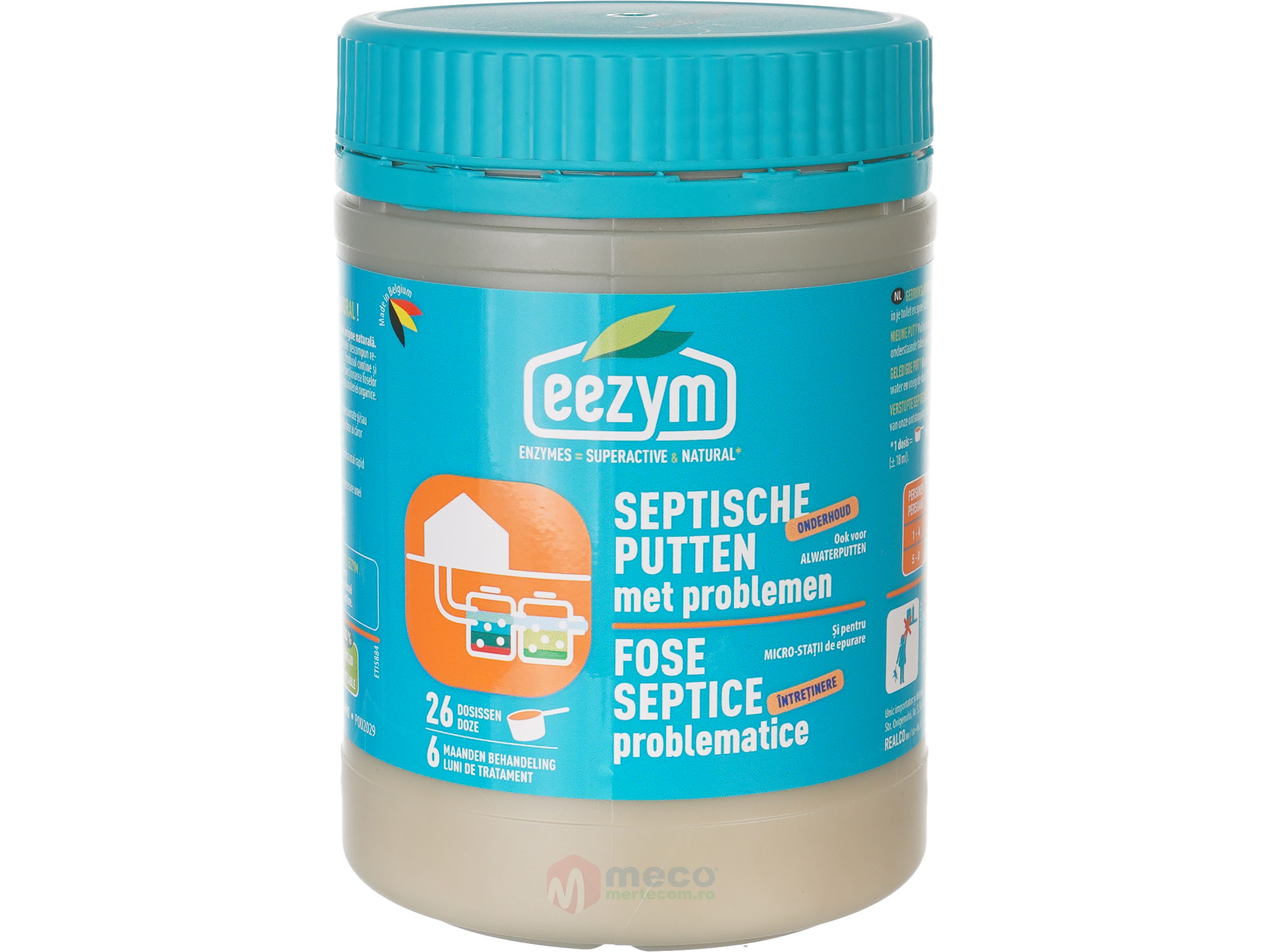 Bioactivator fose septice problematice 6 luni Eezym 650gr - conține de 2x mai multe enzime decât cel pentru mentenanță (eticheta verde). Îl recomandăm pentru fose supraîncărcate sau prea mici.